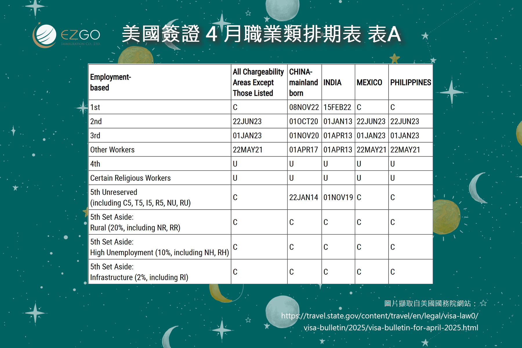 11月份職業移民排期與上月相比有些變化,具體數據請看圖片內容。 根據排期表A(Final Action Dates)審批排期,對於台灣出