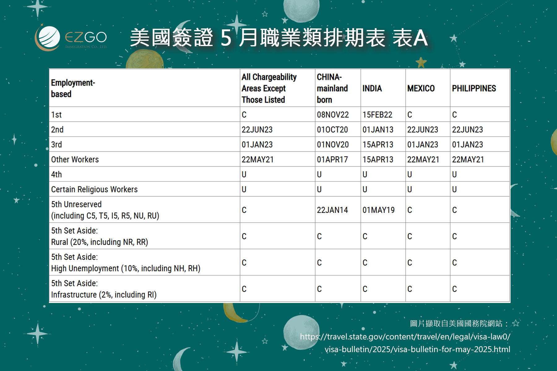 根據排期表A(Final Action Dates)審批排期,對於台灣出生的申請人來說:
