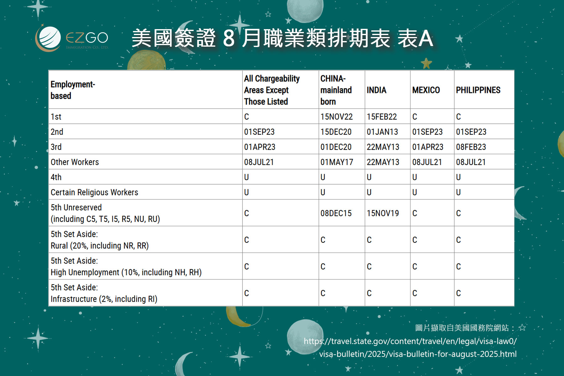 11月份職業移民排期與上月相比有些變化,具體數據請看圖片內容。 根據排期表A(Final Action Dates)審批排期,對於台灣出