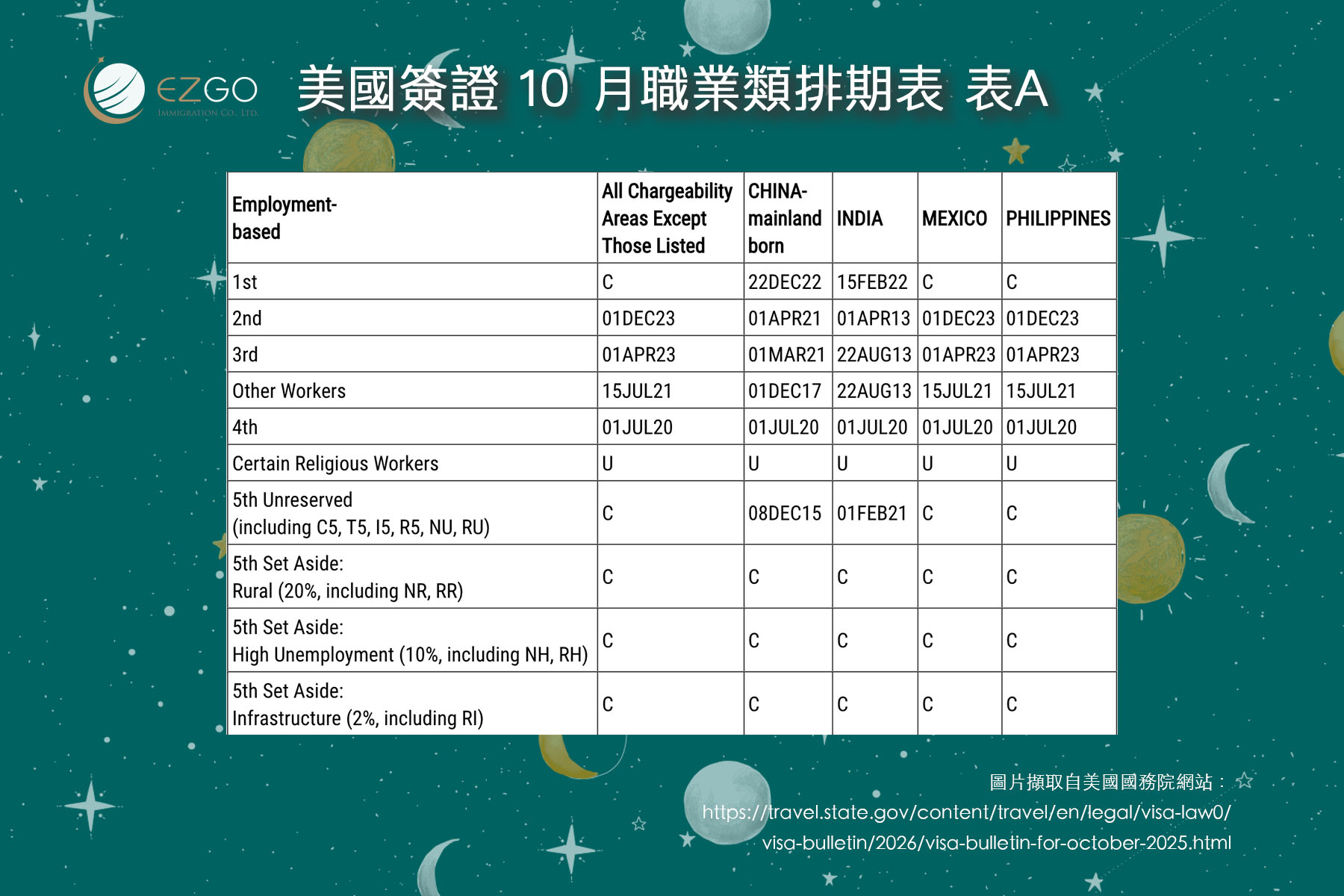 11月份職業移民排期與上月相比有些變化,具體數據請看圖片內容。 根據排期表A(Final Action Dates)審批排期,對於台灣出