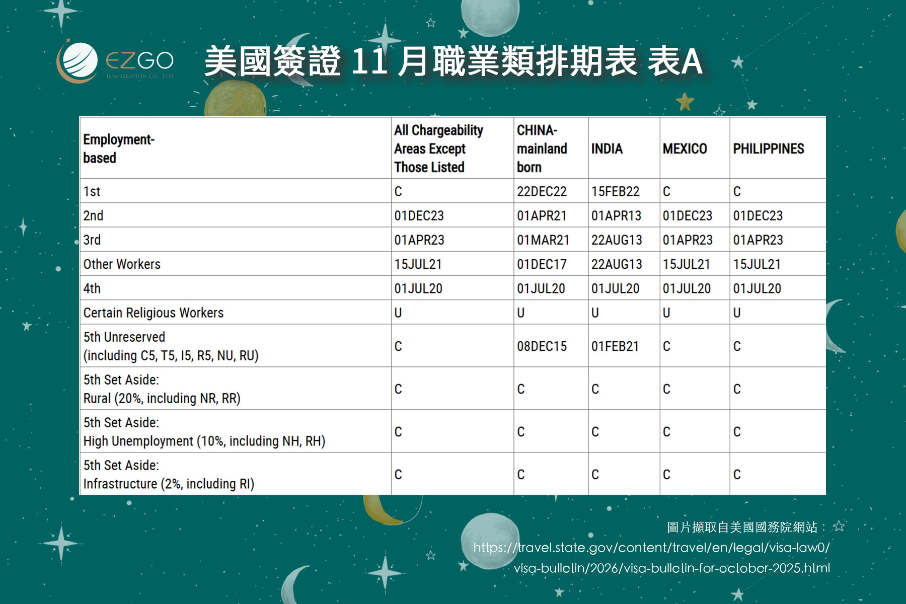 根據排期表A(Final Action Dates)審批排期,對於台灣出生的申請人來說: